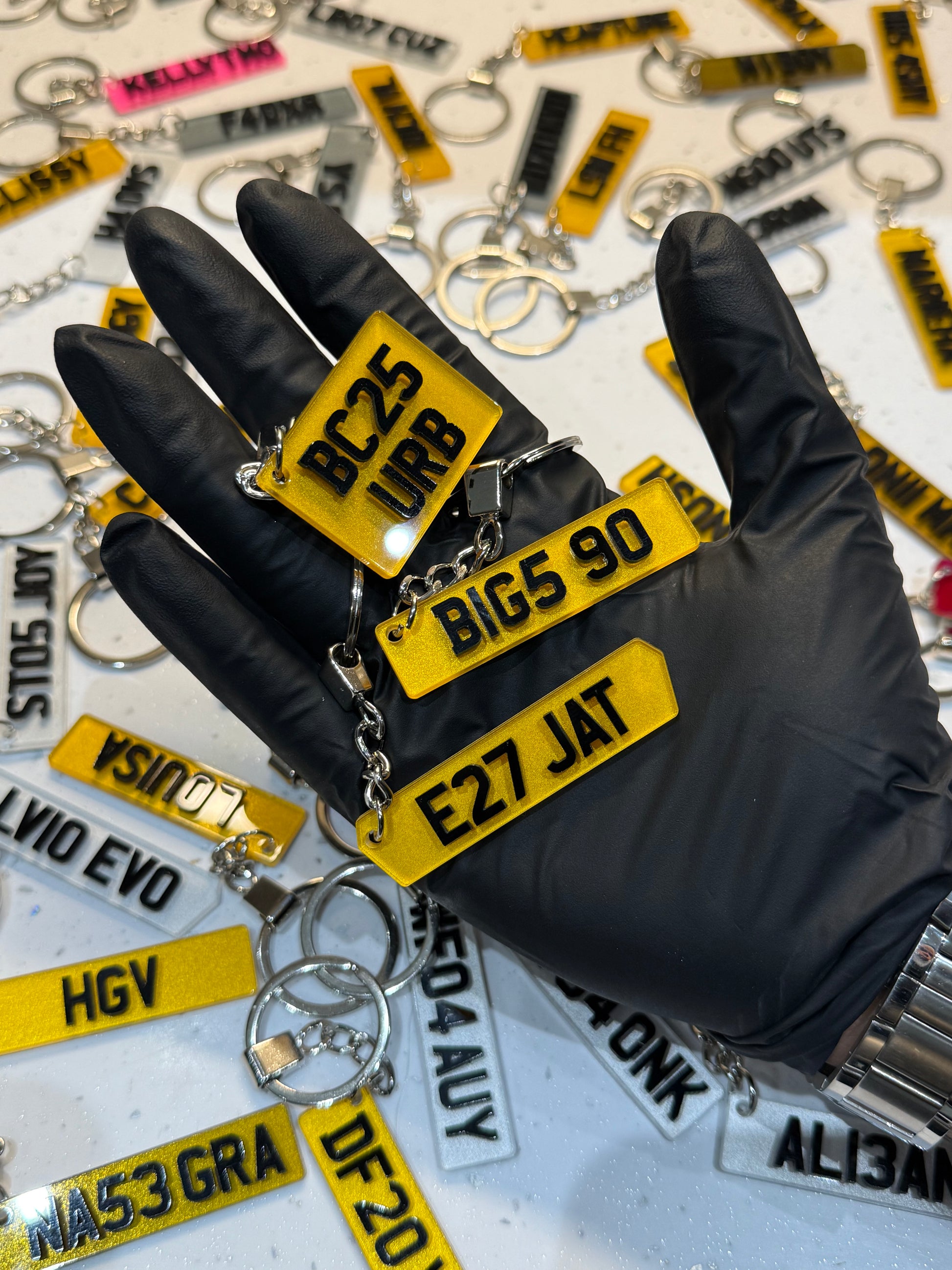 Our artisans create each keychain using a crystal-clear acrylic sheet, layered with reflective vinyl for an authentic touch. We then add raised black acrylic letters to mimic the look of a genuine number plate.
